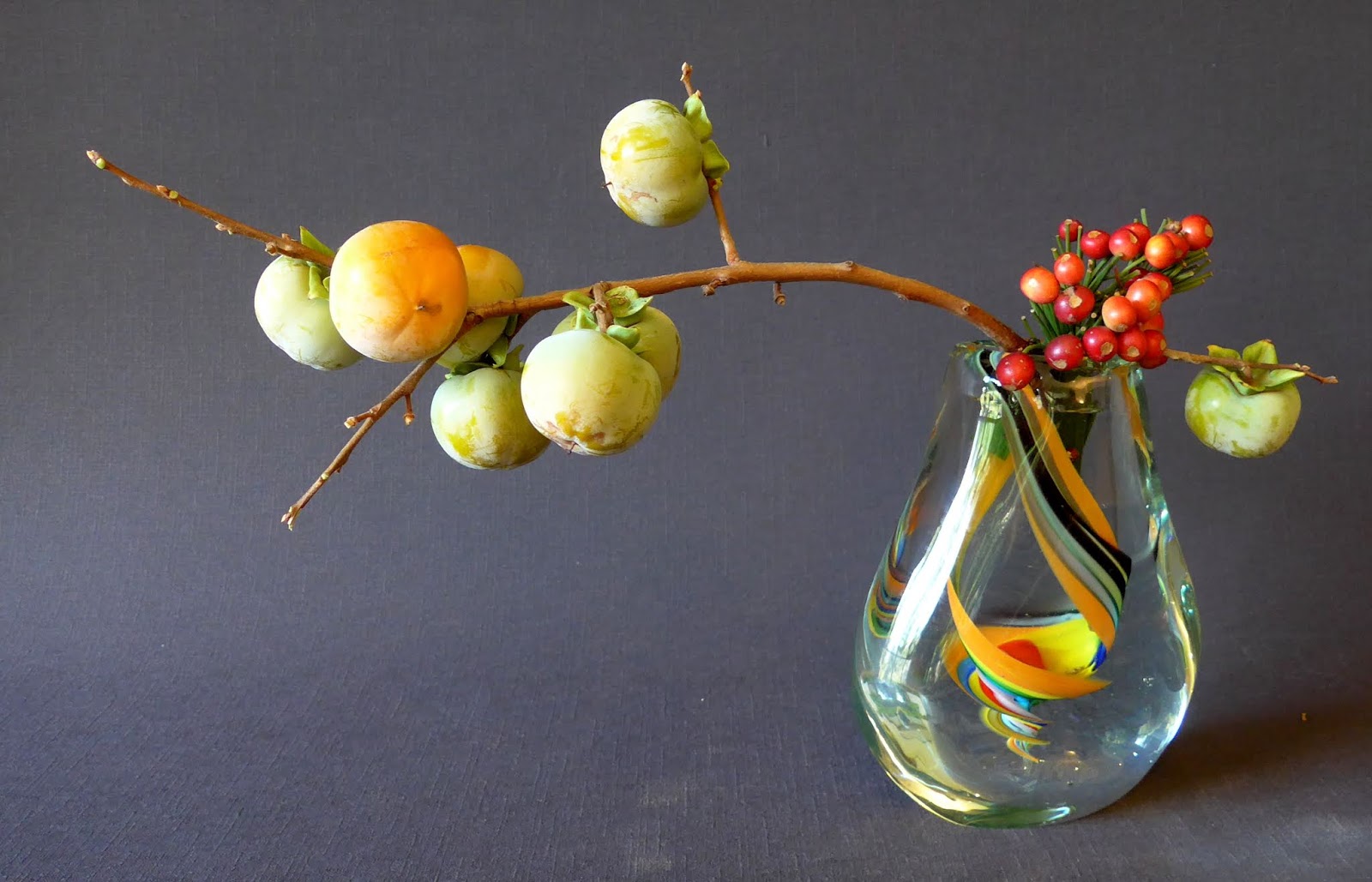 Julie Ireland, our tireless events coordinator, suggested we make one arrangement that non ikebana members of the audience could go home and make themselves. So, I chose a very simple glass vase, two mother-in-law tongues and a small tamarilo to show that we don't need a fancy container or expensive flowers to create something interesting. That's the first photograph, below.