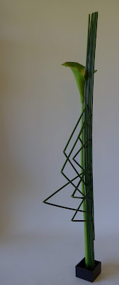 For the senior students I set the theme 'Triangles' and instructed them to interpret this one word theme whichever way they wanted. The only thing I required from them was to produce a good piece of ikebana in the end. I had prepared the arrangement, below on the previous day before I fell ill. I used umbrella grass stems and crucifix orchids. Below mine are arrangements by some of the students. Interestingly, we all used umbrella grass. It is such a versatile material.