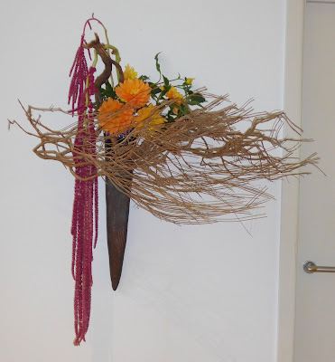 And so to ikebana. My variegated euphorbia, which was much admired whenever I used it, suddenly turned up its toes. I started to remove it and, to my delight, some stems still had some life left in them. So I pruned it right back and used the cuttings for the arrangement, above. I love the pinkish-maroon colour of the stems with the little tufts of grey foliage on the tips. I used three different coloured hydrangeas and a long stem of amaranthus.