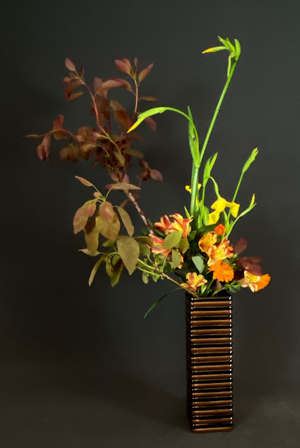 The two themes that were selected were 'Basic Upright Nageire' and 'In a Suiban Without a Kenzan'. No matter our level of expertise, I believe it is necessary, periodically, to go back to basics.
