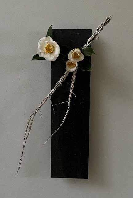 In the arrangement, above, I used a piece of very old bark from some kind of eucalypt, which hung from the ceiling of my storeroom for decades. I placed it in a ceramic container with splits on each side and added Brushfield's Yellow camellias.